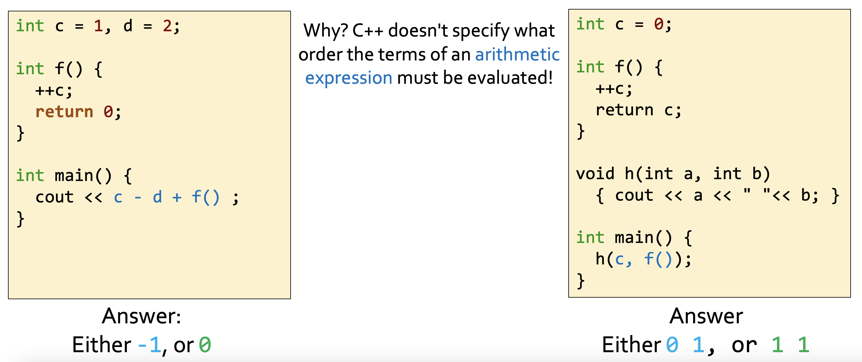 - C++ is not deterministic in the evaluation of the terms of an expression, e.g. evaluating a function in an arithmetic expression or evaluating a function passed as a parameter