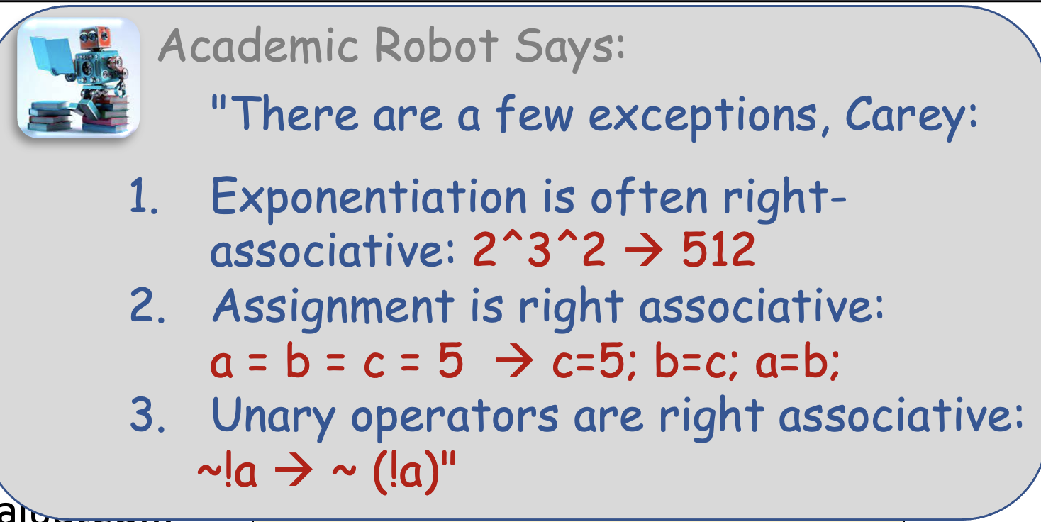 - most mathematical expressions are left-associative and are returned in normal mathematical order, but there are some exceptions