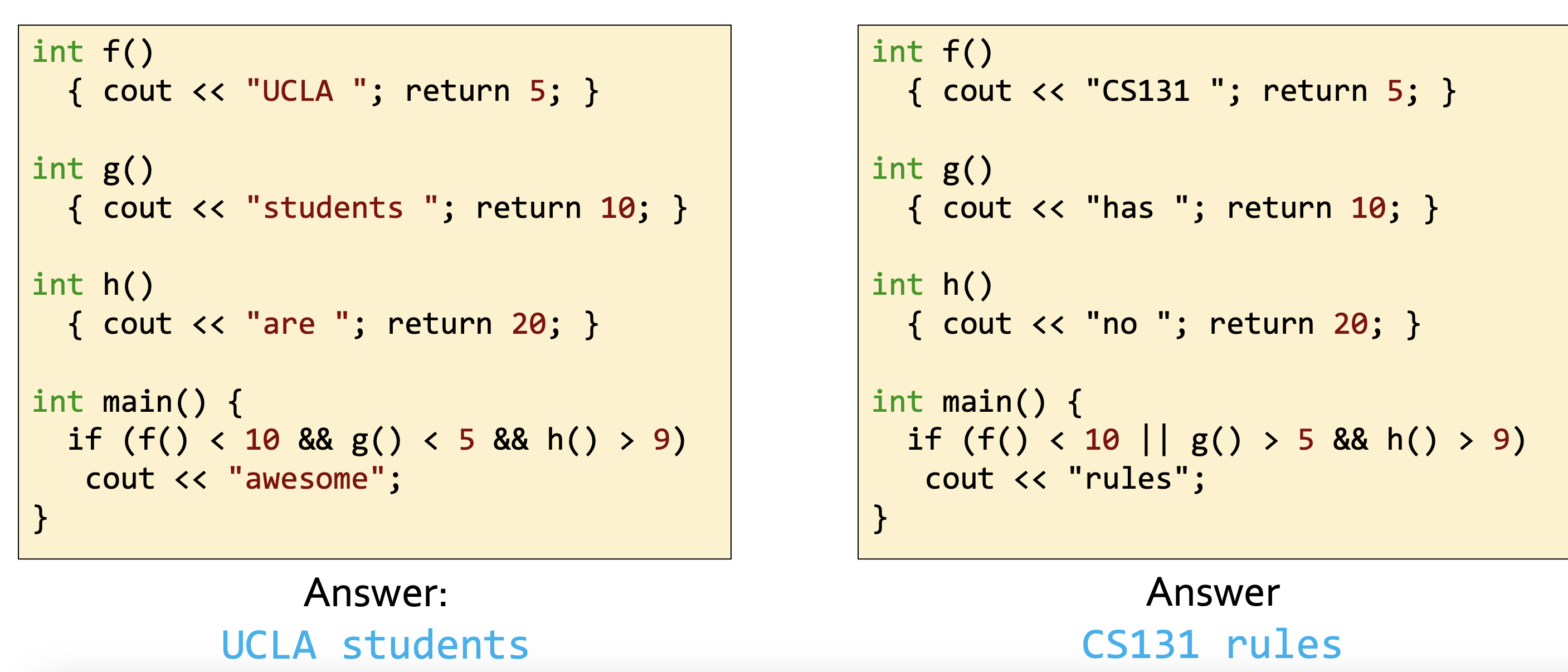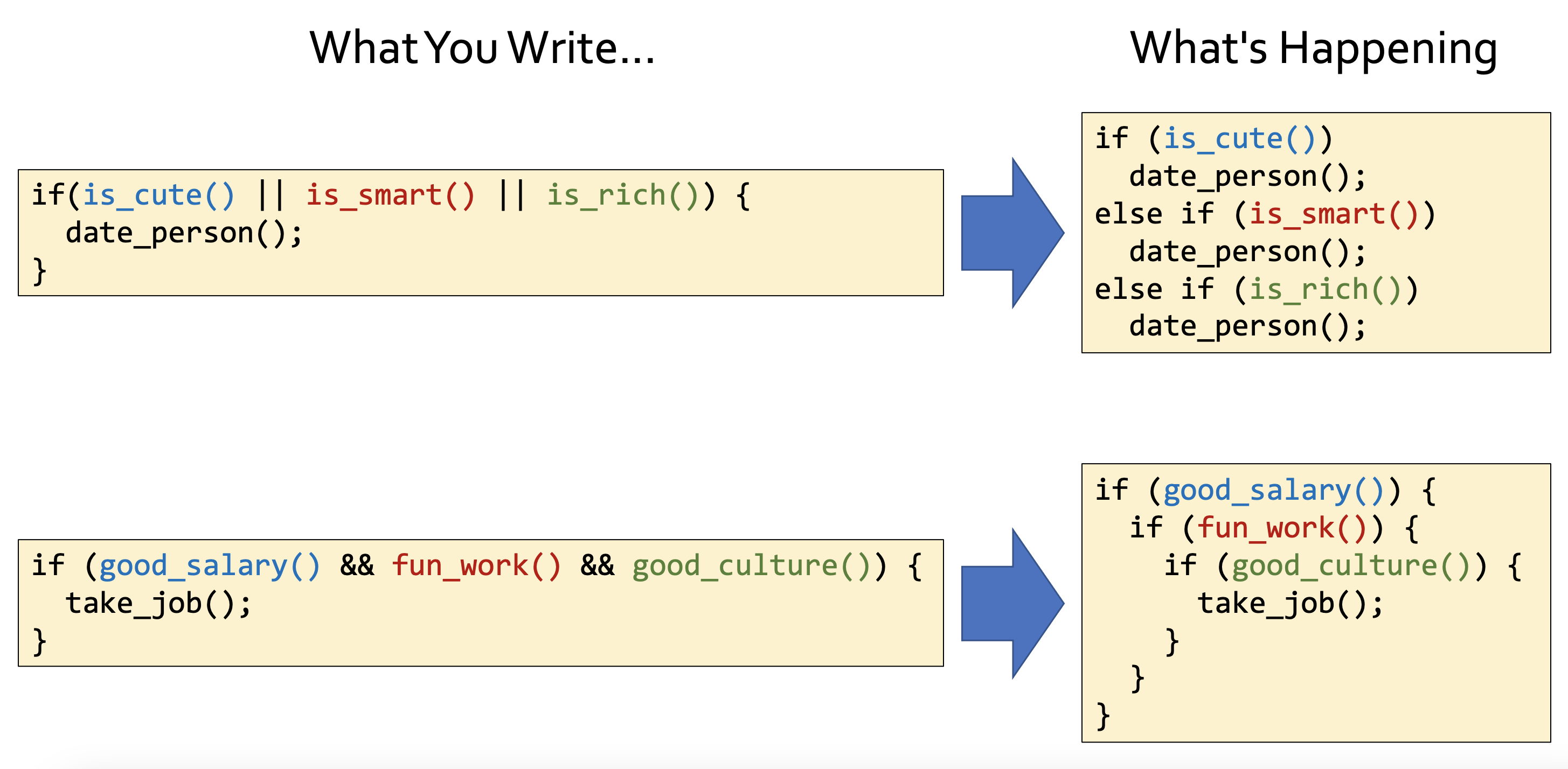 - The program will optimize boolean expressions so that it will “short circuit” and only evaluate as few expressions as possible, left-to-right