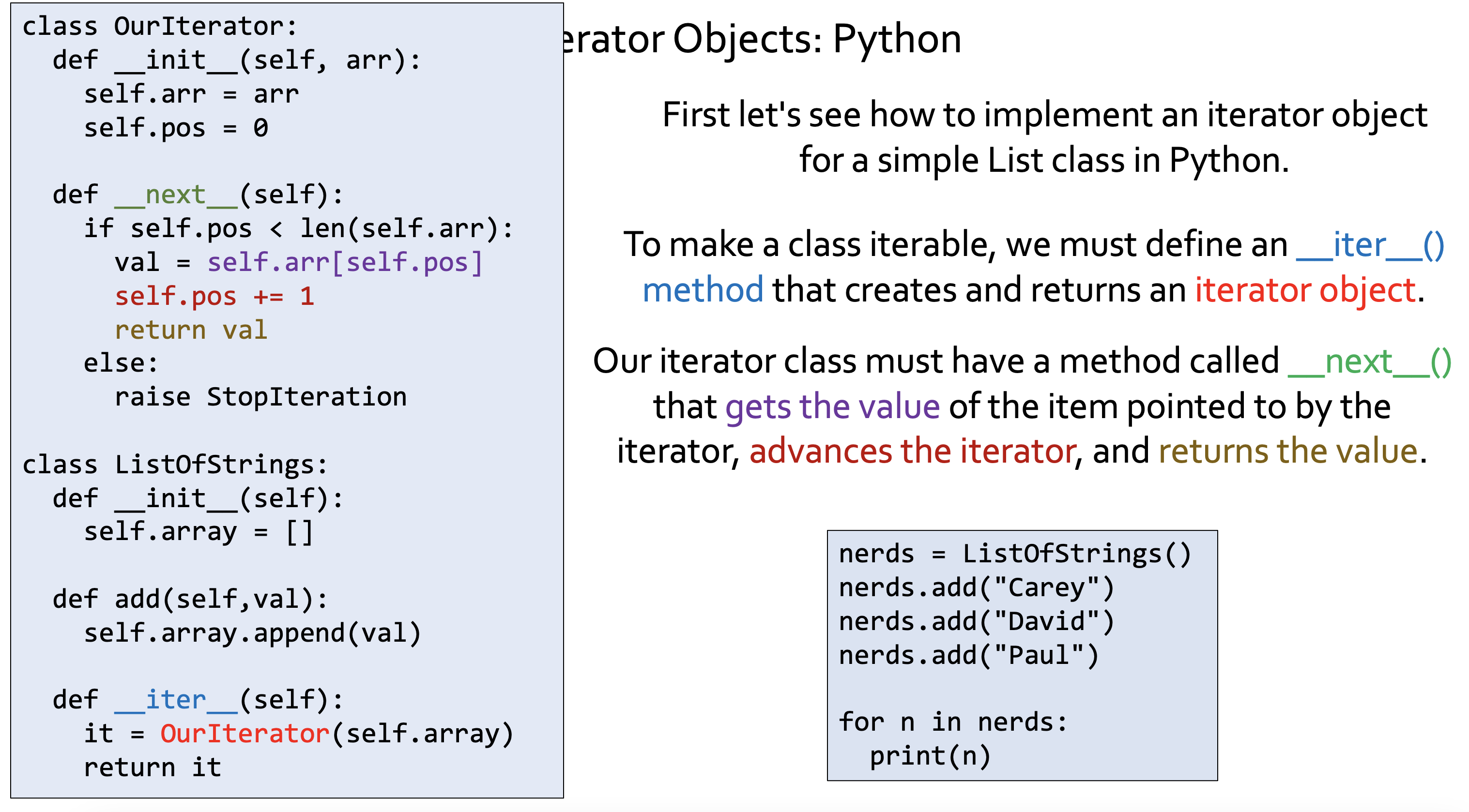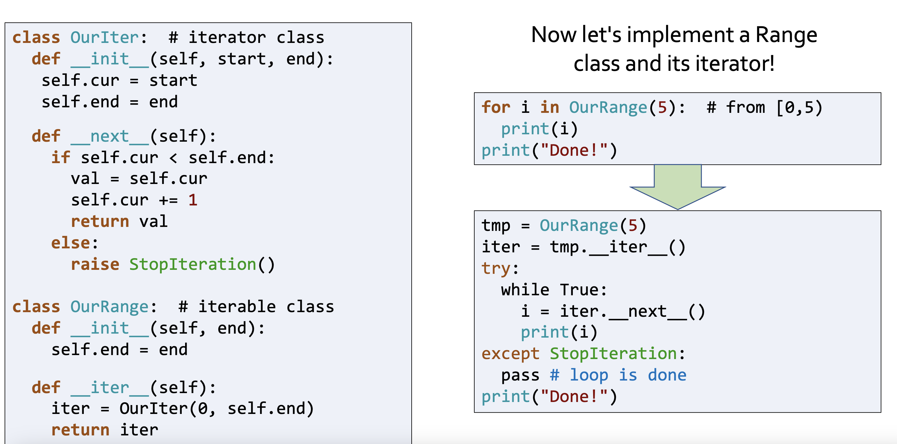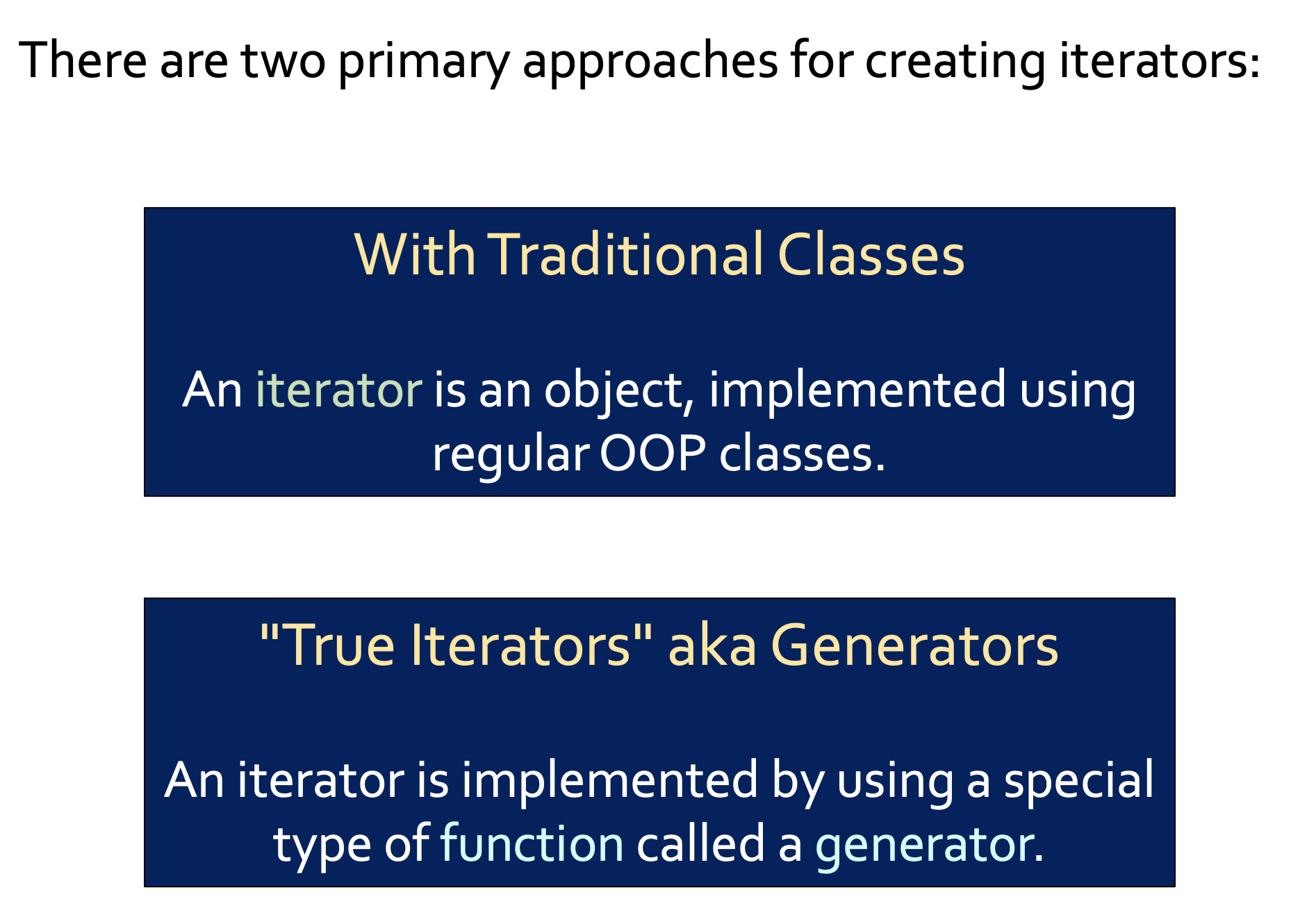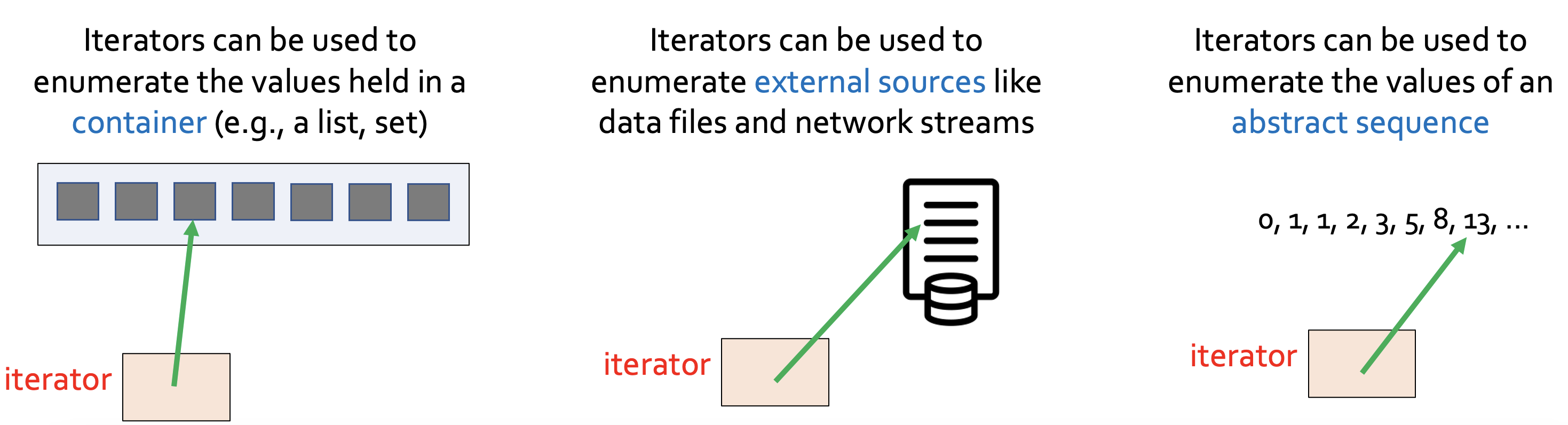 - iterators are distinct from the iterable object so we can have multiple iterators for the same iterable