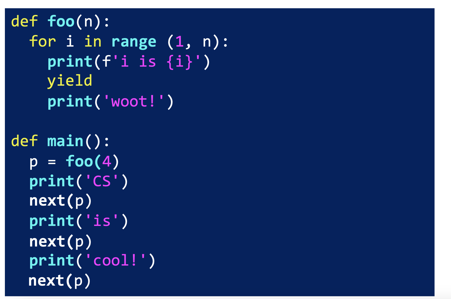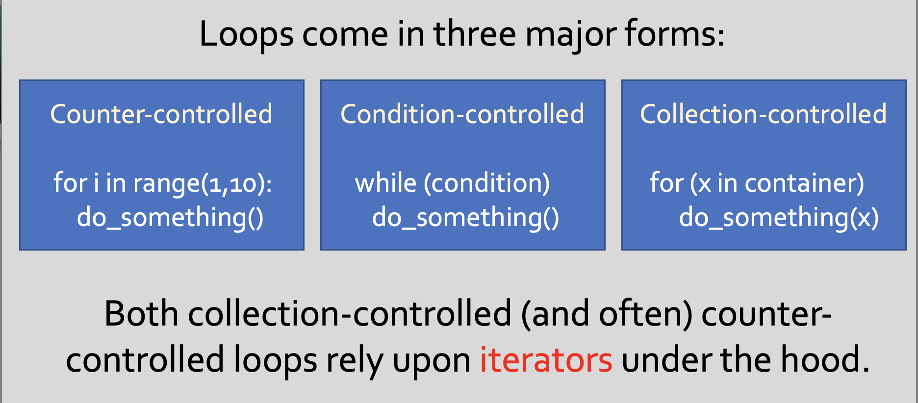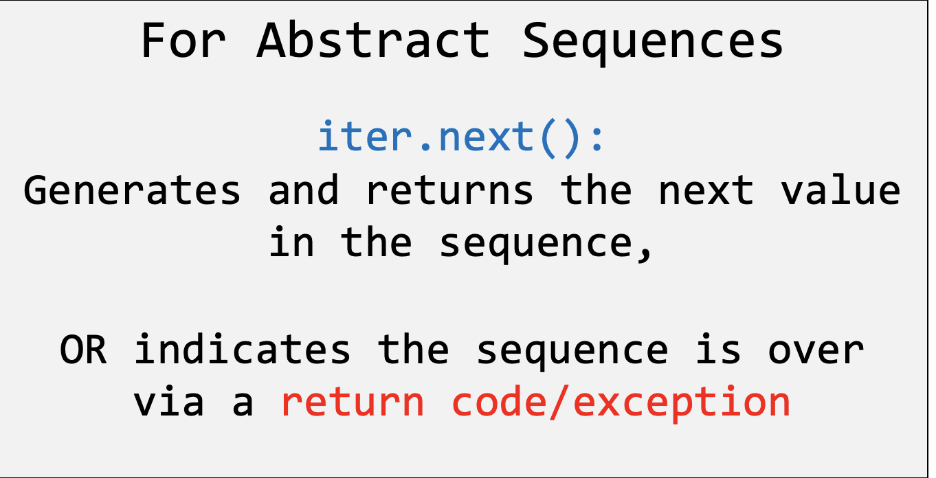 - iterators are distinct from the iterable object so we can have multiple iterators for the same iterable