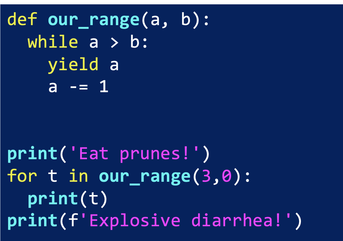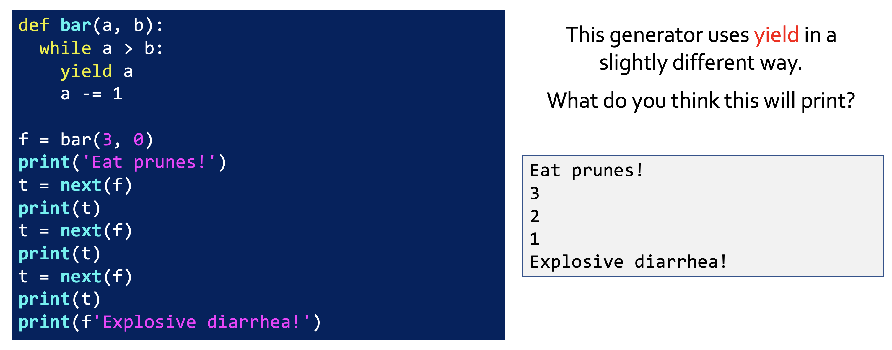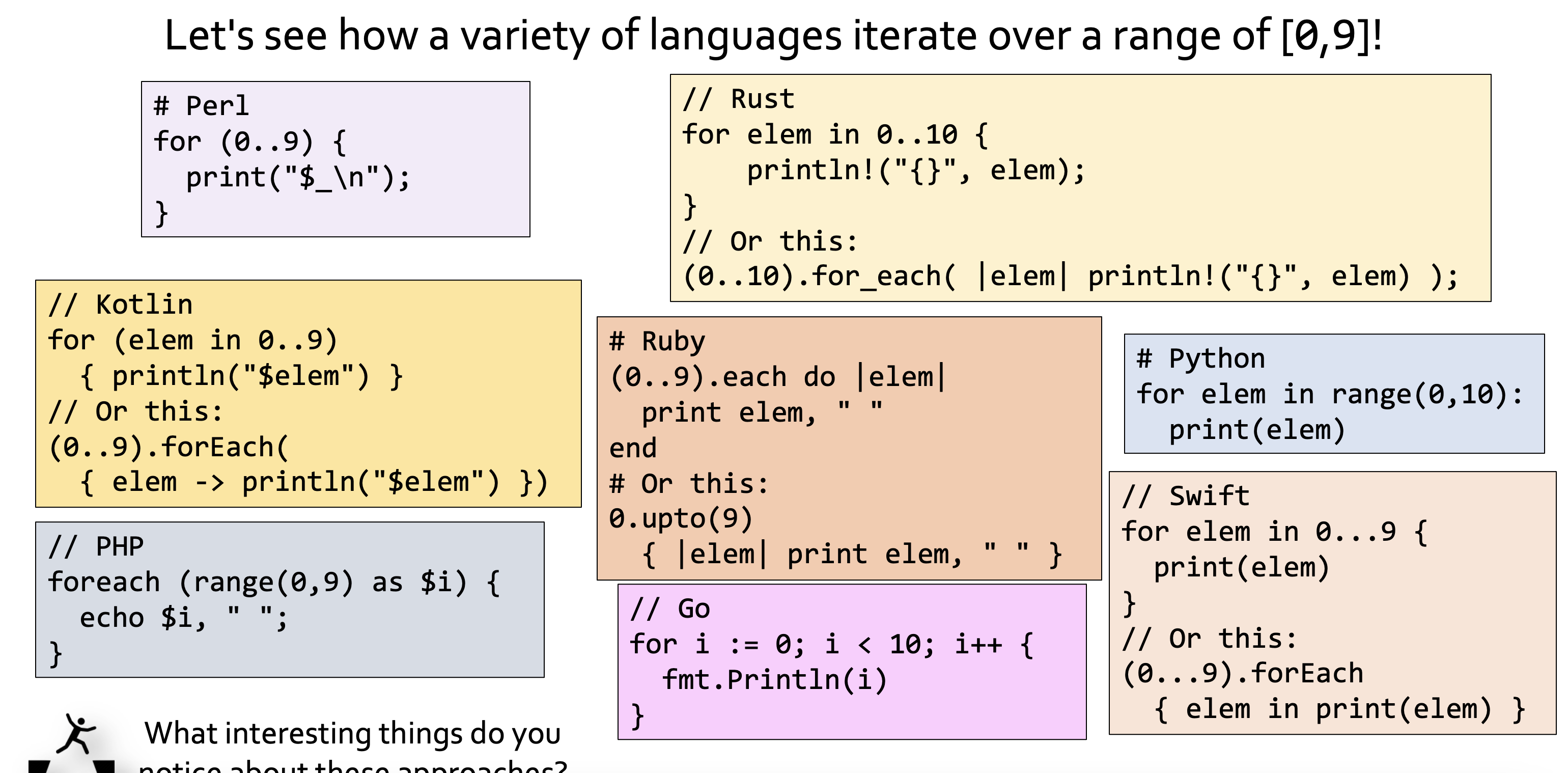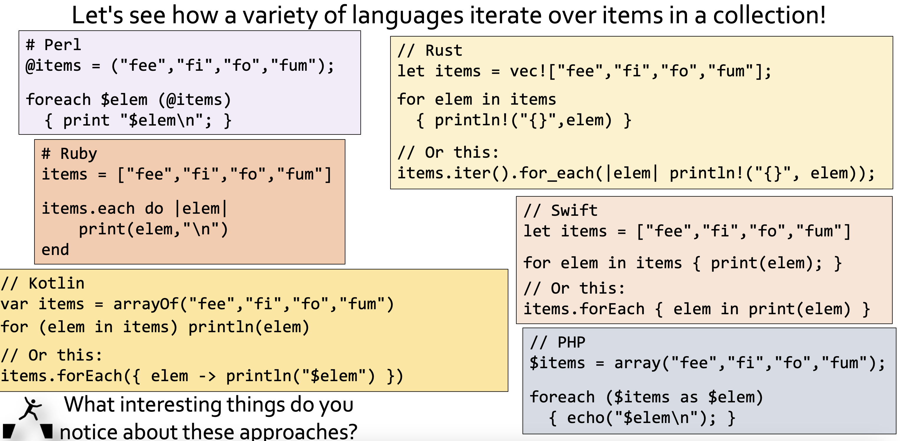 - iterators are distinct from the iterable object so we can have multiple iterators for the same iterable