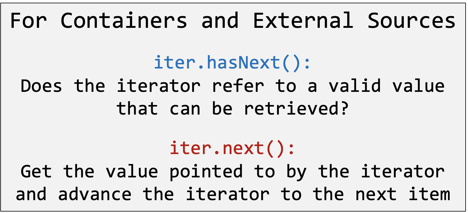 - iterators are generated by the iterable object and may become invalid over execution (e.g., if you delete an object in a vector in C++, the iterator becomes invalid )