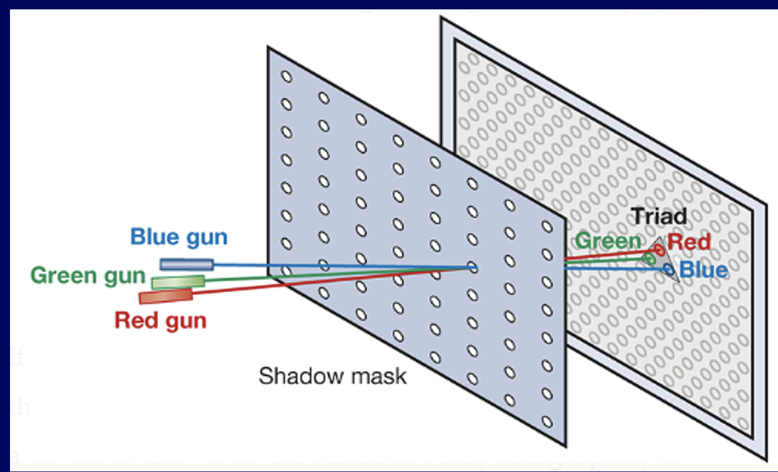 - 3 colored electron guns shoot into a raster mask that creates pixels as triads