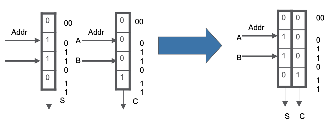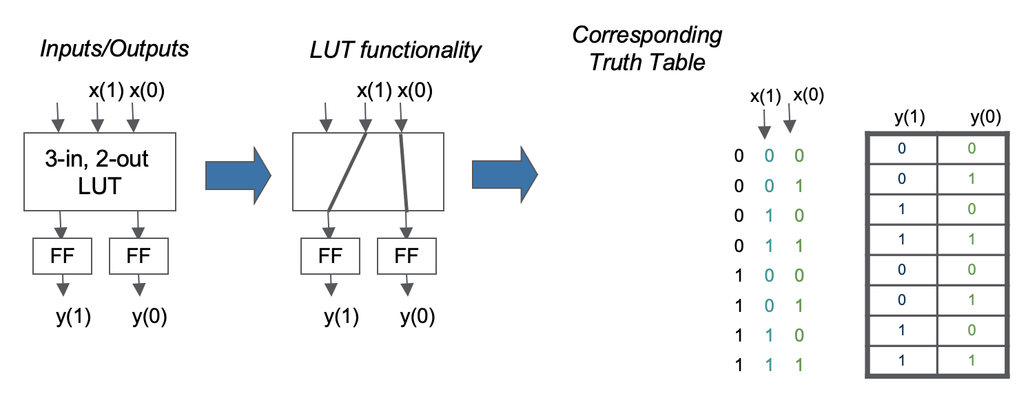 - we make LUTs by optimizing TTs by having some number of inputs and some number of outputs (like a mux):